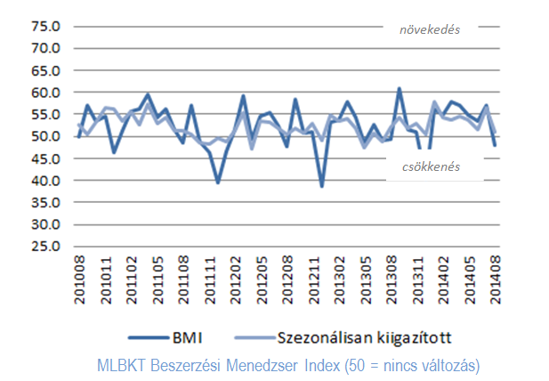 A Beszerzési Menedzser Index (BMI) szezonálisan kiigazított augusztusi értéke: 51,0. Ez alapján a válaszadók nagyobb hányada júliushoz képest összességében kedvezőbb folyamatokról számolt be. 2013 áprilisától kezdve augusztusig az index értéke folyamatosan ingadozott 50 pont körül, nem mutatva semmilyen határozott trendet, most azonban tizenhárom hónapja tart már a bővülés. Az elmúlt egy évben egyszer sem volt 50,0 pont alatt az index, ami arányaiban kedvezőbb a 2012. szeptember – 2013 augusztusa között eltelt évhez képest. A 2014. augusztus havi index 5,6 százalékponttal alacsonyabb a júliusi értéknél (56,6). Augusztus összességében átlag feletti hónap volt a korábbi években (az 1995 óta mért hosszú távú átlag értéke 51,9; az augusztusoké 52,3). Az elmúlt három évben az augusztusi átlag azonban 51,3 pont volt.