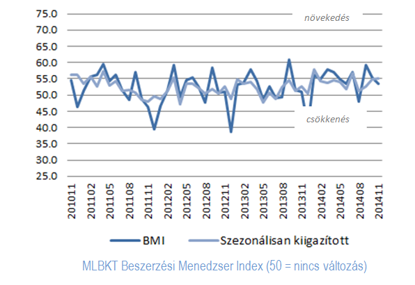 A Beszerzési Menedzser Index (BMI) szezonálisan kiigazított novemberi értéke: 55,1. 2013 áprilisától kezdve augusztusig az index értéke folyamatosan ingadozott 50 pont körül, nem mutatva semmilyen határozott trendet, most azonban tizenhatodik hónapja tart már a bővülés. Az elmúlt egy évben egyszer sem volt 50,0 pont alatt az index, ami arányaiban kedvezőbb a 2012. december – 2013 novembere között eltelt évhez képest. A 2014. november havi index 0,1 százalékponttal magasabb az októberi értéknél (55,0). November összességében átlagos hónap volt a korábbi években (az 1995 óta mért hosszú távú átlag értéke 51,9; a novembereké 51,9). Az elmúlt három évben a novemberi átlag azonban 51,1 pont volt. Az idei érték a legmagasabb novemberi érték 2010 óta.