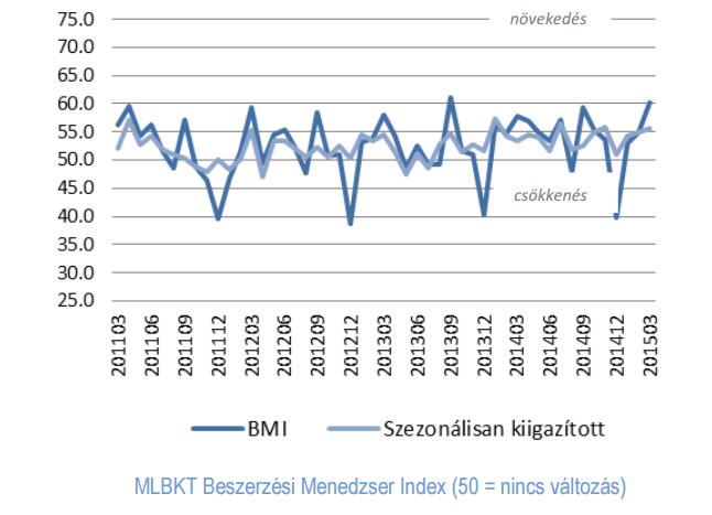 A Beszerzési Menedzser Index (BMI) szezonálisan kiigazított márciusi értéke: 55,6. Ez alapján a válaszadók nagyobb hányada februárhoz képest összességében kedvezőbb folyamatokról számolt be. 2013 áprilisától kezdve augusztusig az index értéke folyamatosan ingadozott 50 pont körül, nem mutatva semmilyen határozott trendet, most azonban huszadik hónapja tart már a bővülés. A 2015. március havi index 0,6 százalékponttal magasabb a februári értéknél (55,0), és az elmúlt hat hónapban ötször hasonló ütemű bővülést jelez. Március összességében átlag alatti hónap volt a korábbi években (az 1995 óta mért hosszú távú átlag értéke 52,0; a márciusoké 51,8). Az elmúlt három évben a márciusi átlag azonban 54,4 pont volt. Az idei érték a legmagasabb márciusi érték 2007 óta.