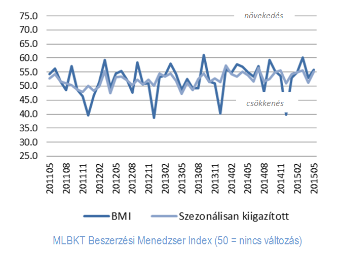A Beszerzési Menedzser Index (BMI) szezonálisan kiigazított májusi értéke: 55,1. 2013 áprilisától kezdve augusztusig az index értéke folyamatosan ingadozott 50 pont körül, nem mutatva semmilyen határozott trendet, most azonban huszonkettedik hónapja tart már a bővülés. Az elmúlt egy évben egyszer sem volt 50,0 pont alatt az index, ami arányaiban kedvezőbb a 2013. június – 2014. május között eltelt évhez képest. A 2015. május havi index 3,9 százalékponttal magasabb az áprilisi értéknél (51,2), és hasonló ütemű bővülést jelez ez év január-március hónapjaihoz képest. Május összességében átlag feletti hónap volt a korábbi. Az elmúlt három évben a májusi átlag ez alatti, 51,4 pont volt. Az idei érték a legmagasabb májusi érték 2000 óta.