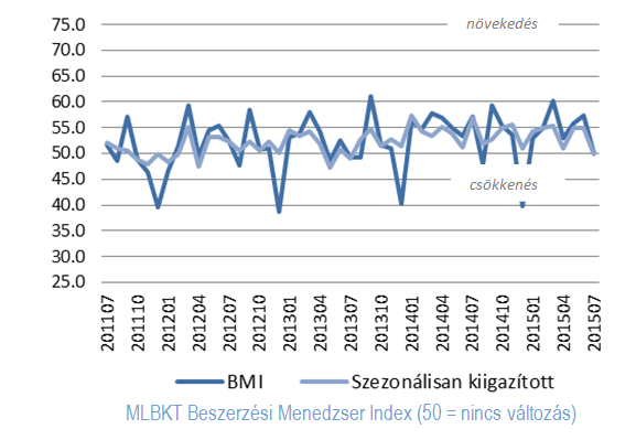 A Beszerzési Menedzser Index (BMI) szezonálisan kiigazított júliusi értéke: 50,0. Ez alapján a válaszadók júniushoz képest összességében változatlan folyamatokról számoltak be. 2013 áprilisától kezdve augusztusig az index értéke folyamatosan ingadozott 50 pont körül, nem mutatva semmilyen határozott trendet, most azonban huszonharmadik hónapja tart már a bővülés. Az elmúlt egy évben egyszer sem volt 50,0 pont alatt az index. A 2015. július havi index 4,9 százalékponttal alacsonyabb a júniusi értéknél (54,9). Július összességében átlag feletti hónap volt a korábbi években (az 1995 óta mért hosszú távú átlag értéke 52,0; a júliusoké 52,3). Az elmúlt három évben a júliusi átlag e feletti, 52,8 pont volt. Az idei érték az ötödik legalacsonyabb júliusi érték 1995 óta.