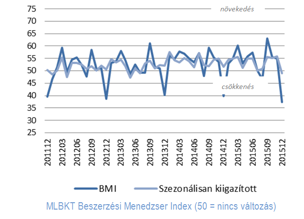 A Beszerzési Menedzser Index (BMI) szezonálisan kiigazított decemberi értéke: 49,1. Ez alapján a válaszadók novemberhez képest összességében kedvezőtlenebb folyamatokról számoltak be, melyekben meghatározó szerepe van az ünnepek miatti rövidebb hónapnak és sok válaszadónál az év végi tervezett leállásoknak. Huszonnyolc hónapig tartott a bővülés, aminek most decemberben vége szakadt. A 2015. december havi index 6,7 százalékponttal alacsonyabb a novemberi (55,8) értéknél, és az idei évben az eddigi legkisebb. Az elmúlt egy évben jellemzően 55 pont, illetve 51 pont körül tömörültek a havi megfigyelések. Az idei érték a harmadik legalacsonyabb decemberi érték 1995 óta.