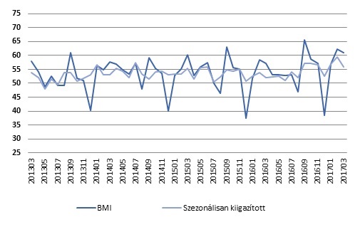 Az index értéke némileg csökkenve visszatért a közelmúltban gyakran tapasztalt 56-57 pontos sávhoz. A 2017 március havi index 3,4 százalékponttal alacsonyabb a februári (59,4) értéknél, és az elmúlt egy hatodik év legmagasabb értéke. Március összességében átlag alatti hónap volt a korábbi években (az 1995 óta mért hosszú távú átlag értéke 52,2; a márciusoké 52,1). Az elmúlt három évben a márciusi átlag ennél magasabb volt (53,5). Az idei érték így átlag feletti márciusi értéknek tekinthető 1995 óta.