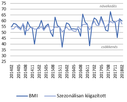 A Beszerzési Menedzser Index (BMI) szezonálisan kiigazított februári értéke: 57,4. Ez alapján a válaszadók az előző hónaphoz képest összességében kedvezőbb folyamatokról számoltak be. Az év végi trend végig kedvező képet mutatott, és ez folytatódik 2018 elején is. Az ütem némileg lassult, de az index továbbra is bővülést jelez.