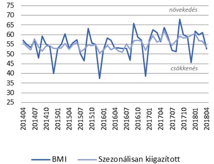 A Beszerzési Menedzser Index (BMI) szezonálisan kiigazított áprilisi értéke: 53,3. Ez alapján a válaszadók az előző hónaphoz képest összességében kedvezőbb folyamatokról számoltak be. Az év végi trend végig kedvező képet mutatott, és ez folytatódik 2018 elején is. Az ütem némileg ismét lassult, de az index továbbra is bővülést jelez.