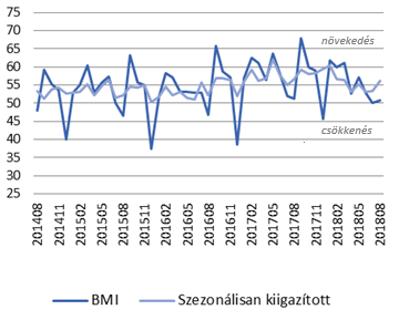 A Beszerzési Menedzser Index (BMI) szezonálisan kiigazított augusztusi értéke: 56,2. Ez alapján a válaszadók az előző hónaphoz képest összességében kedvezőbb folyamatokról számoltak be. Az év első felében a trend végig kedvező képet mutatott, és ez folytatódik 2018 második felében is. Az ütem gyorsult, és az év eleji értékekhez áll inkább közelebb.