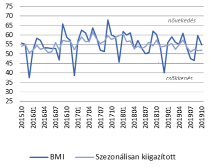 Az ütem azonban továbbra is enyhe maradt, az elmúlt három évben csak két alacsonyabb érték volt (2019. július és szeptember, rendre 51,2 és 51,7). A 2019 október havi index nagyobb a szeptemberi (51,7) értéknél, és a tizenötödik legmagasabb októberi érték. Október összességében átlag alatti hónap volt a korábbi években (az 1995 óta mért hosszú távú átlag értéke 52,6; az októbereké 52,4). Az elmúlt három évben az októberi átlag ennél magasabb volt (57,2), köszönhetően a 2016-2018-as évek egyenletesen gyorsabb ütemének (rendre: 56,6; 57,5; 57,3), az idei érték összességében így átlag alatti októberi értéknek tekinthető 1995 óta.