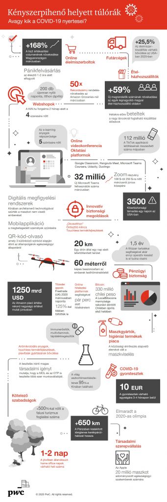 A járvány legsúlyosabb hetei alatt számtalan cikk és tanulmány született a COVID-19 veszteseiről, valamint rendelkezünk egy általános képpel az egyértelmű nyertesekről is, úgymint a maszk- és kézfertőtlenítő-gyártók, vagy az e-kereskedelem. Kevesebb szó esik viszont azokról az ágazatokról és vállalati szereplőkről, akik közvetetten tudtak előnyt kovácsolni a pandémia által megváltozott körülményekből. A PwC Magyarország Kényszerpihenő helyett túlórák – Avagy kik a COVID-19 nyertesei? című tanulmányának célja egy szélesebb kép kialakítása a világjárvány nyerteseiről, rámutatva olyan összefüggésekre is, melyek nem tekinthetők magától értetődőnek.