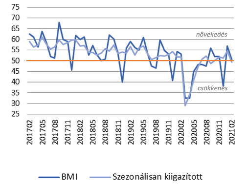 A 2021 február havi index kisebb a januári (54,5) értéknél, és a harmadik legalacsonyabb februári érték. Február összességében átlag feletti hónap volt a korábbi években (az 1995 óta mért hosszú távú átlag értéke 52,4; a februároké 52,8). Az elmúlt három évben a februári átlag ennél magasabb volt (55,0), köszönhetően a 2018-2019-es évek gyorsabb ütemének (rendre: 56,8;56,6). Az idei érték így átlag alatti februári értéknek tekinthető 1995 óta.