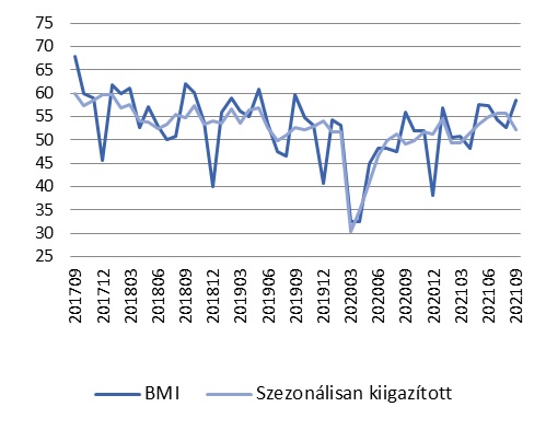 A bővülés üteme gyengébb lett, de a BMI-t alkotó részindexek összességében továbbra is kedvező képet mutatnak: az új rendelések mennyisége továbbra is dinamikusan bővült, a vásárolt készletek mennyisége szinte megtartotta múlt havi erős növekedési ütemét. A termelt mennyiség gyengébb ütemben, de tovább bővült. A foglalkoztatottság alindexe múlt havi szűkülése gyakorlatilag eltűnt. A szállítási átfutási idő értéke ezúttal is némileg növekedett, az elmúlt fél év második legmagasabb értékére, de továbbra is nagyon alacsony maradt és az átfutási idők hosszabbodását jelzi számos válaszadónál, még mindig utalva a globális ellátási láncok működésében érzékelhető problémákra. A 2021 szeptember havi index kisebb az augusztusi (55,6) értéknél, és a tizenötödik legmagasabb szeptemberi érték. Szeptember összességében átlag feletti hónap volt a korábbi években (az 1995 óta mért hosszú távú átlag értéke 52,4; a szeptembereké 52,7). Az elmúlt három évben a szeptemberi átlag az e havinál minimálisan magasabb volt (52,2).