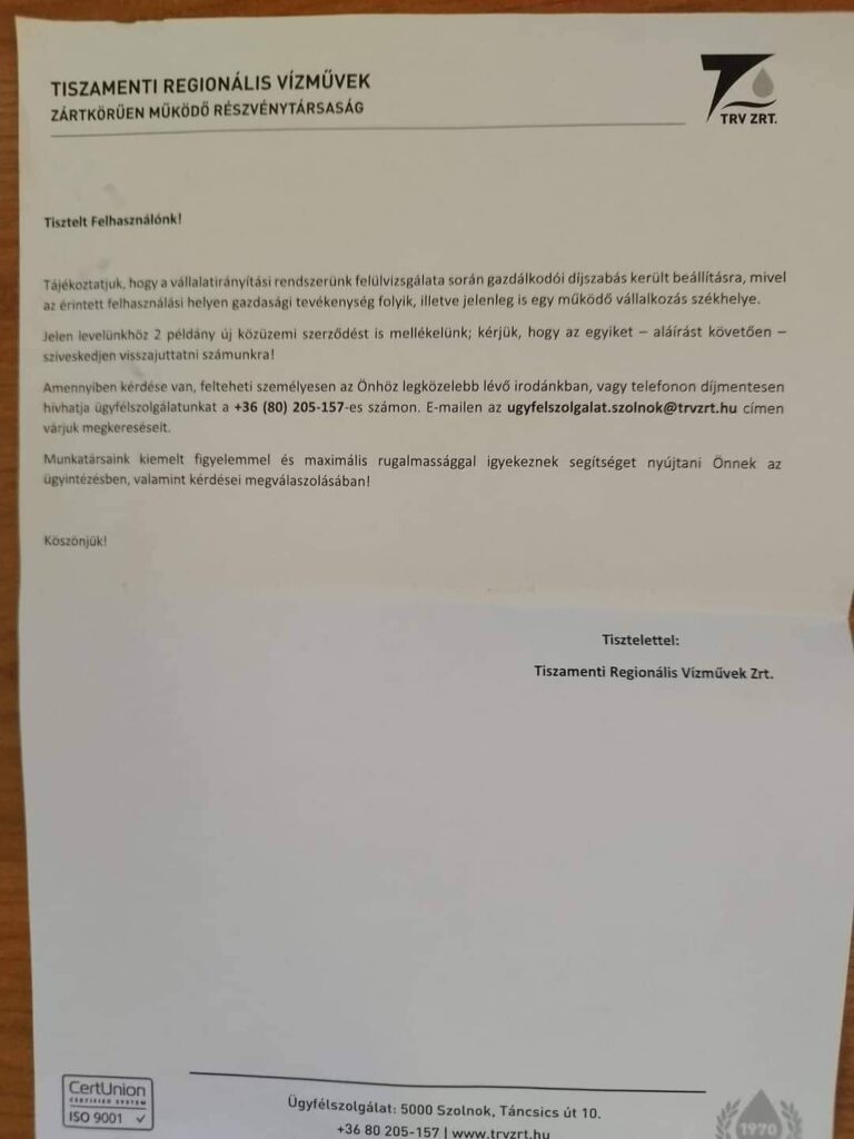 – Egy kollégánk másodállásban üzleti tanácsadással foglalkozik egyéni vállalkozóként, és székhelye a saját tulajdonú ingatlanába van bejegyezve, azonban a vízmű szolgáltatási szerződését még a vállalkozása indítása előtt magánszemélyként kötötte meg. A napokban kapott egy levelet a helyi közműszolgáltatótól, amelyben a TRV Zrt. jelezte, hogy a magánszemélyekre vonatkozó rezsicsökkentett tarifa helyett, a gazdasági szervezetekre szabott piaci árazást állított be – írta Nagy Attila.