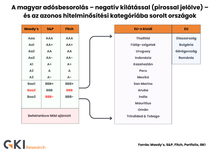 Az adósbesorolás alapján Magyarország olyan országokkal szerepel azonos kategóriában, mint Kazahsztán, a Fülöp-szigetek vagy India. Az Európai Unión belül Magyarország mellett Olaszország, Görögország, Románia és Bulgária tartozik ebbe a minősítési sávba, míg a többi tagállam ennél kedvezőbb besorolással rendelkezik.