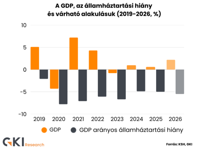 A kormány jelenlegi várakozása szerint 2026-ban is magas marad a hiány (5% körül). A jelenlegi szakértői konszenzus a hazai GDP növekedését 2% körülire várja (a kormány 3,1%-os prognózisával szemben). Amennyiben a tényleges gazdasági növekedés a kormányzati várakozásokhoz képest alacsonyabb lesz, a kamatkiadások tartósan magas szintje és a kiigazító intézkedések elmaradása esetén 2026-ban a tervezettnél magasabb hiányhoz vezet.