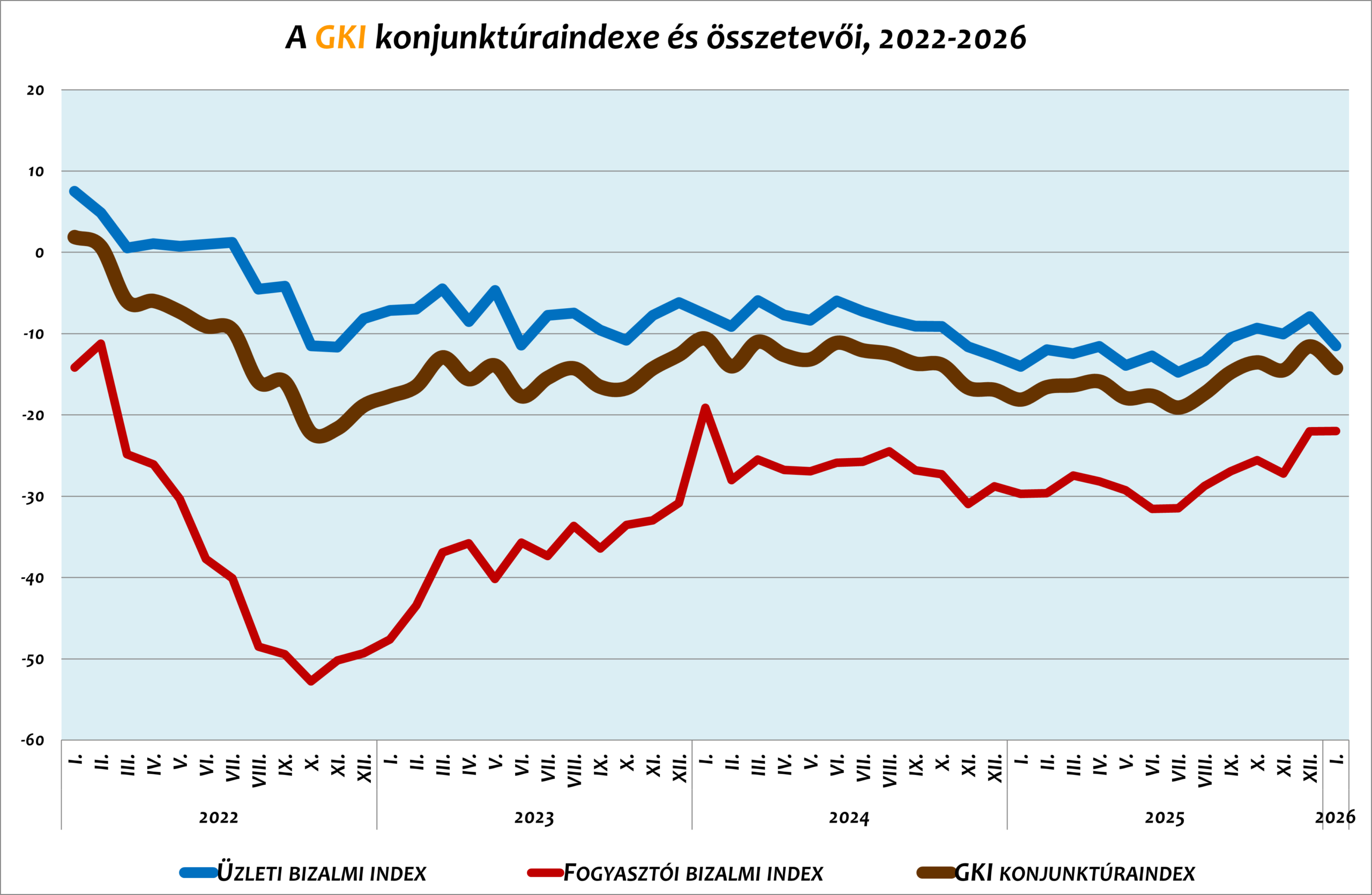 A GKI Gazdaságkutató Zrt. – az EU támogatásával végzett – felmérése szerint januárban a fogyasztók kilátásai nem változtak decemberhez képest, de a cégeké némileg romlottak. A kilátások összefoglaló jelzőszáma, a GKI konjunktúra indexe csaknem 3 ponttal csökkent. A cégek foglalkoztatási hajlandósága nem változott, az értékesítési árak várható alakulására vonatkozó összesített várakozás havi alapon enyhén emelkedett. A válaszadó cégek az első idei hónapban a gazdálkodási környezet kiszámíthatóságát érezhetően javulónak ítélték.