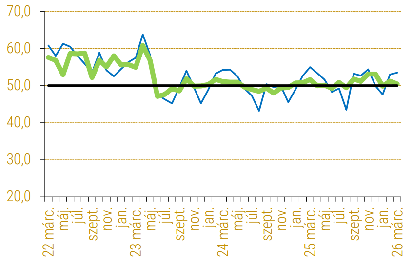 - A korábbi március havi értékekkel összevetve az idei érték alacsonyabb, mint a hosszú távú e havi átlag (51,8), és alulmúlja az előző három év e havi értékeinek átlagát (51,0).